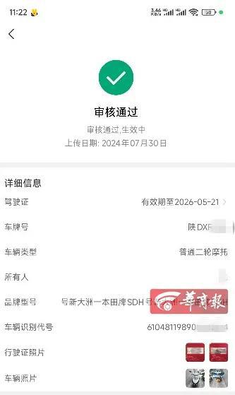 华商报大风新闻记者在焦先生提供的平台◆■◆★★◆“我的交通工具”一栏中看到,焦先生的工具为新大洲摩托车,车辆类型为普通二轮摩托,附有车辆照片及行驶证,状态为“审核通过★◆◆”。